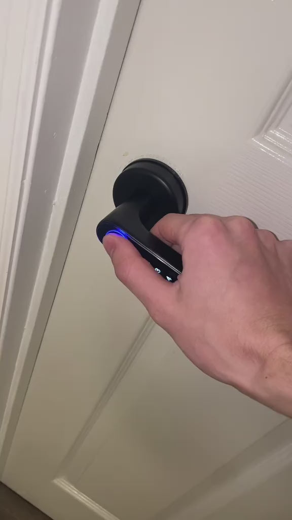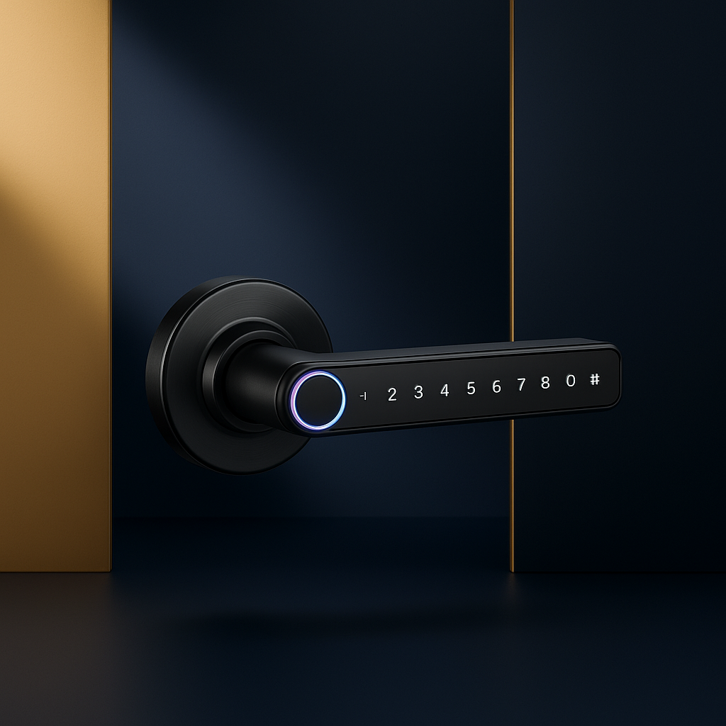 هيكل أنيق من الألمنيوم الأسود مع إضاءة دائرية ناعمة حول زر البصمة، يضيف لمسة عصرية لأي باب.